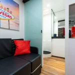 - Kitchen, Bathroom, Dining Area, Couch with Pull-Out Bed, Mini-Split AC for Heating & Cooling, Color Changing Lights, Storage Space